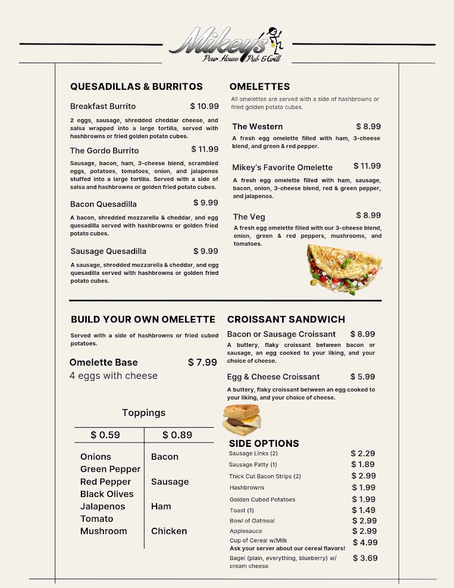 Mikey's Pour House Pub and Grill offers a straightforward and inviting menu that suits a variety of casual dining occasions. Whether you're stopping by for a hearty breakfast to start your day or settling in for a relaxed dinner with friends, the menu balances comforting classics with familiar pub favorites.